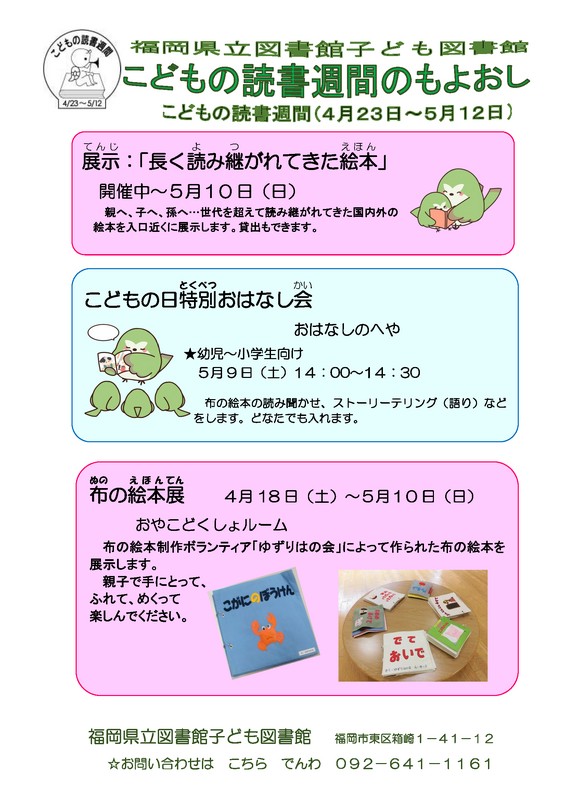 福岡県立図書館子ども図書館では、4月23日から5月12日までの「こどもの読書週間」に合わせて催しを行います。