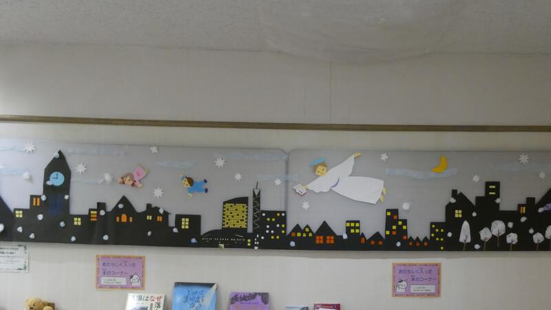 子ども図書館の壁の装飾と、別館ロビー装飾が新しくなり、すっかり冬仕様になりました⛄