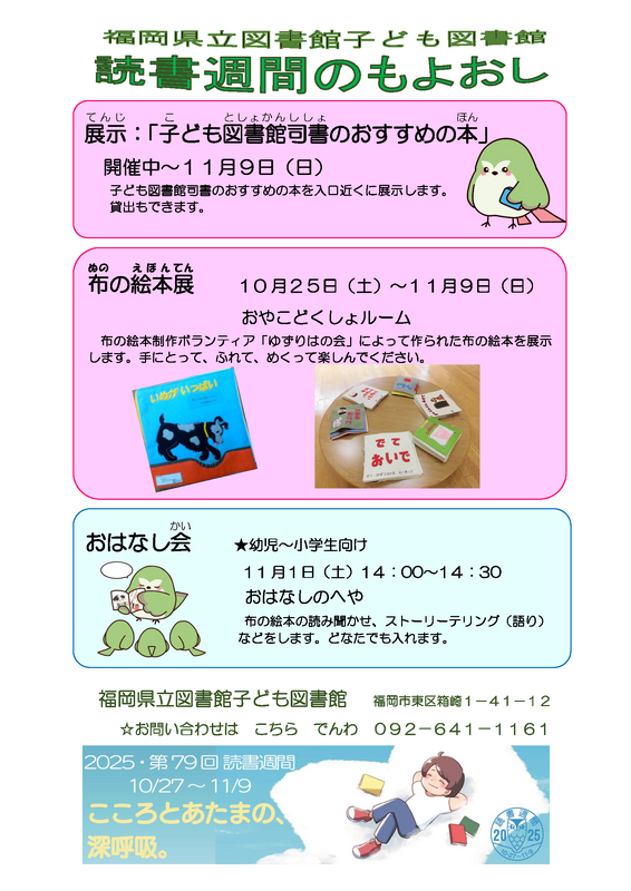 読書週間事業について 投稿日時 : 09/26 cadmin 福岡県立図書館子ども図書館では、10月27日から11月9日までの「読書週間」に合わせて催しを行います。 子ども図書館司書のおすすめの本や布の絵本の展示、布の絵本の読み聞かせを含むおはなし会を行います。 詳しくは下記のチラシをご覧ください。 皆様のご来館をお待ちしています。 Tweet {{options.likeCount}} {{options.likeCount}} {{options.unlikeCount}} {{options.unlikeCount}} 0 コメント