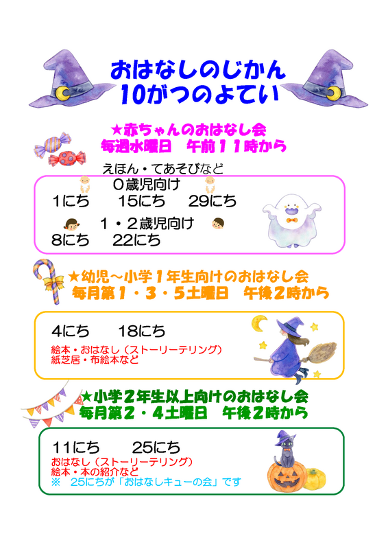 絵本、布の絵本、紙芝居、おはなしなど毎週違うプログラムです。 (第1・3・5週)土曜日 午後2時~ |