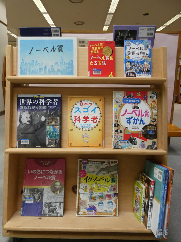 子ども図書館では、ノーベル賞に関する本を集めて展示をしています!